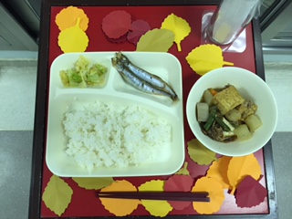 焼きししゃもは、料理酒で下味をつけたししゃもを、焼き物機で蒸し焼きにした焼き物献立でした。牛肉とあつあげの煮ものは削りぶしで取っただしに、牛肉とにんじん、だいこん、れんこんなどの根菜類の野菜、そしてあつあげが入った煮もの献立でした。キャベツの梅風味は塩ゆでしたキャベツに、梅肉を使った手作りの甘酢たれを和えた和え物献立でした。