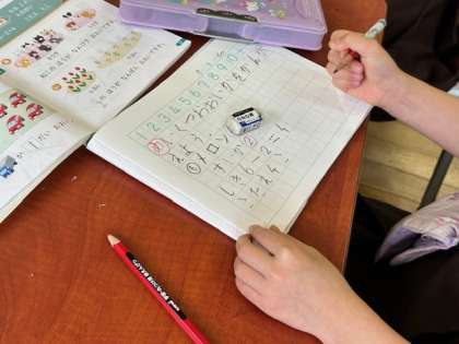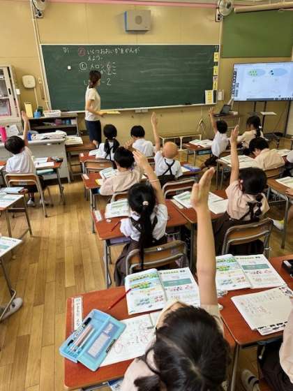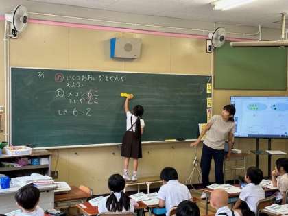 1年生は、算数科で「いくつ多いかな??」の学習をしていました。「比べる」つまり「引き算」で式を立てて答えを見つけます。みんな、楽しんで勉強していました。