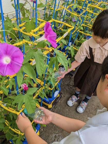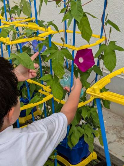 朝顔が大きく育ってきました。紫や青の花が咲き出しています。つぼみもたくさんできています。