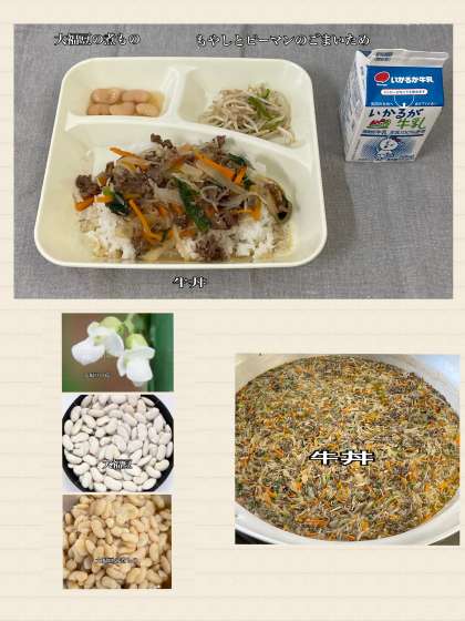 ※牛丼 ※もやしとピーマンのごまいため ※大福豆の煮もの