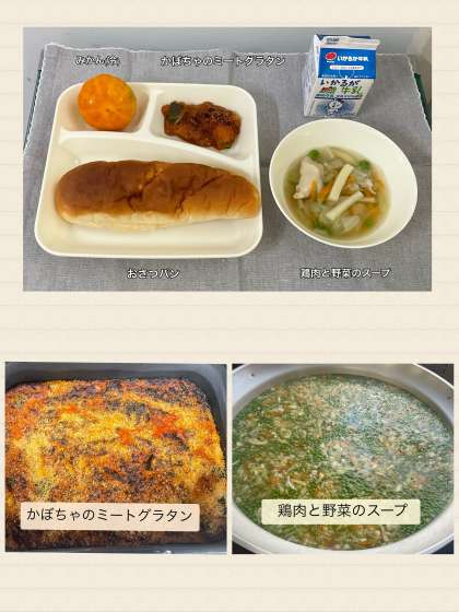 ※かぼちゃのミートグラタン ※鶏肉と野菜のスープ ※みかん(冷)