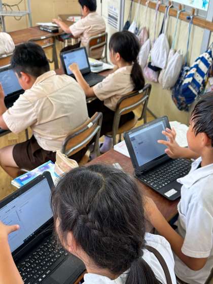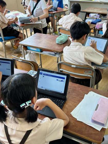 3年生は授業用PCを使ってデジタルドリルに挑戦していました。ほとんどの児童が手早く操作して、すらすらと問題に答えていました。答えが合わないと、じっくり考えて再度挑戦します。パソコンが答えを教えてくれるというのも、便利な世の中になりました。