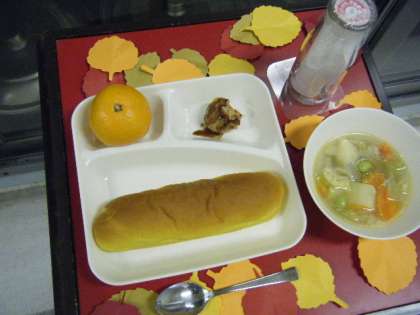 本日の献立は「たこボール・洋風煮・みかん・パン・牛乳」でした。