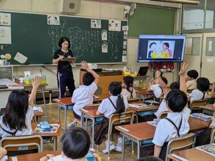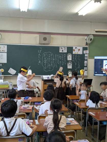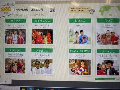 道徳の学習で、色々な国の挨拶の学習をしました。中国出身のお友達にも、中国語で「早上好」(ざおしゃんはお)と教えてもらいました。