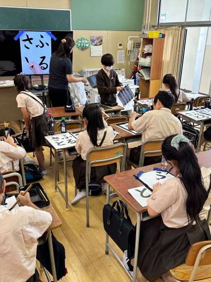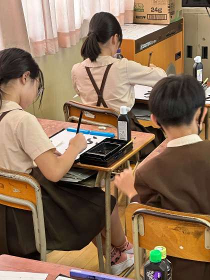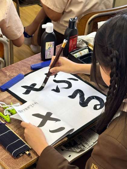 五年生は、国語で習字で「ふるさと」を一生懸命書いていました。集中して筆を動かし、手本通りに書き上げていました。