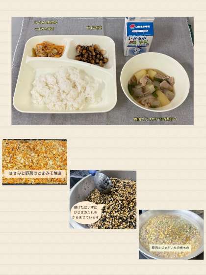 ※豚肉とじゃがいもの煮もの ※ひじき豆 ※ささみと野菜のごまみそ