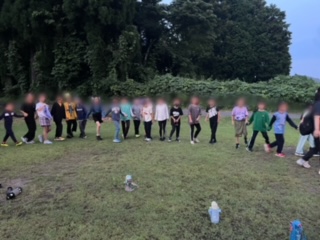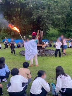 火の神から六つの火を授かり、キャンプファイヤーの始まりです。「燃えろよ燃えろ」を合唱し、炎立ち上がるなかで、まずはマイムマイムで友情を深めます。