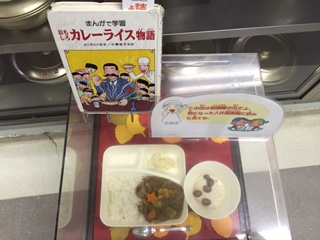 写真左は本日の給食サンプルです。本日の給食図書は「おもしろカレーライス物語」でした。