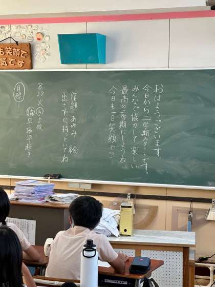 各教室では、夏休みの思い出を発表したり、宿題集めたり、係決めを行ったりなど、さまざまな活動が行われていました。どの子もみんな笑顔で、やる気にあふれているように感じました。