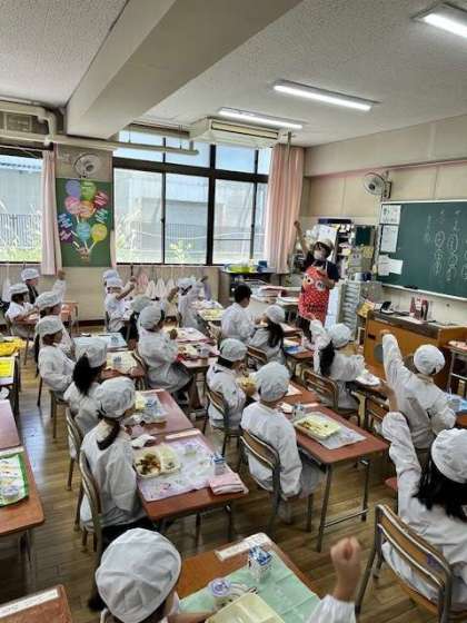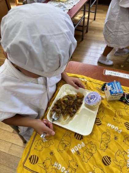 2学期最初のメニューは「カレー」で、「ブドウゼリー」も付いていて、子どもたちにとっては大人気のメニューです。すばらしい食べっぷりでした。