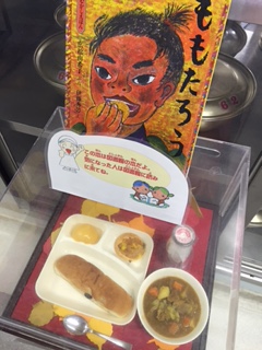 写真左は本日の給食サンプルです。また、本日の給食図書はデザートの白桃(缶)にちなんで、「ももたろう」でした。