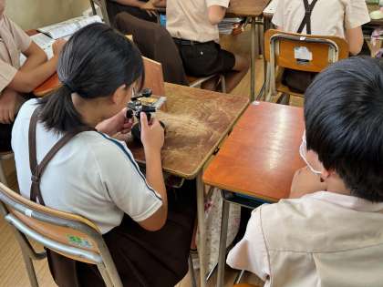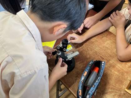 5年生の理科では、かいぼう顕微鏡をつかってプレパラートなどを見る実習を行っていました。慣れないうちは、明るさの調整やピントの合わせ方が難しいのが特徴です、班で協力して楽しみながら取り組んでいました。
