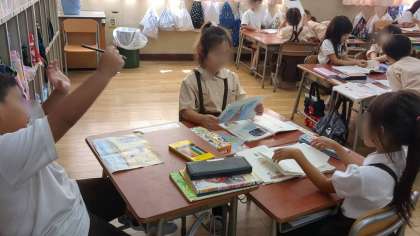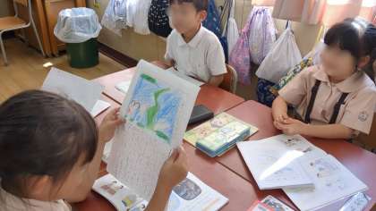 夏休みにしたことを、グループのみんなに話しました。声の大きさに気をつけて話しました。聞いたあとは、質問や思ったことも話しました。