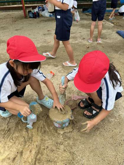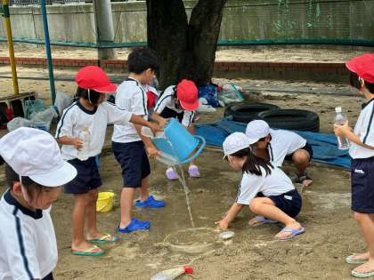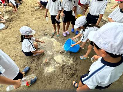 あるグループは穴を掘って水をたくさん流していました。あるグループはドロドロを容器に入れてパフェ。他にも泥団子をつくったり、ドロンコに足を入れて感触を確かめたりと、思い思いの活動を行っていました。笑顔が絶えず、本気で楽しんでいる子どもたちの姿が見られました。