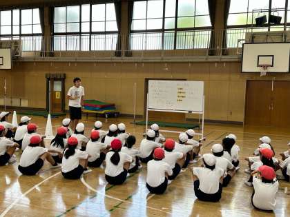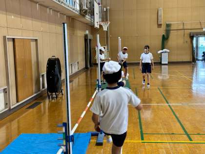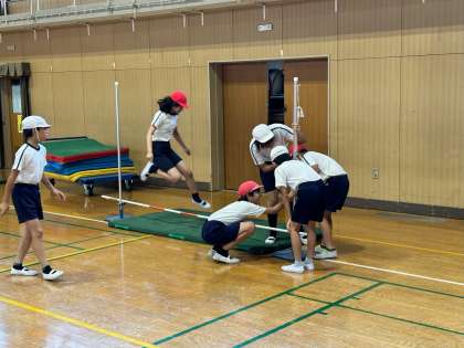 五年生の体育では高跳びの学習をしていました。高く飛ぶというのにもコツがいります。タイミングや力の入れ方、足の動きなど、チームで試行錯誤しながら挑戦していました。