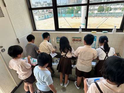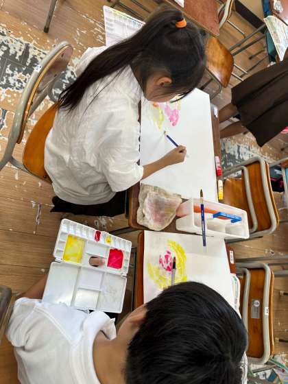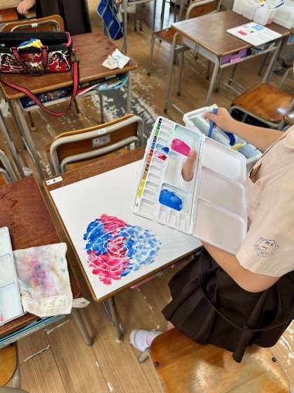3年生の図工では、絵の具をつかって花を描いていました。水を多めに使い、にじみを利用する技法ですね。子どもたちは集中して取り組んでいました。