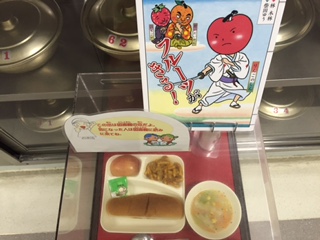 明日の献立は「赤魚のしょうゆだれかけ・みそ汁・おおさかしろなのいためもの・ごはん・牛乳」です。明日の献立も楽しみにしていてくださいね。