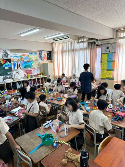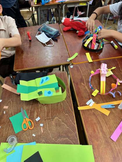 6年生は図工で冠を使っていました。様々な形の色画用紙を組み合わせて、オリジナルの作品を作ります。それぞれ工夫があって完成が楽しみです。