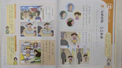 道徳の学習「どちらがいいかな」で、あいさつをする時やお友だちの家に遊びに行った時の場面を通して、礼儀正しくするとどんないいことがあるかを考えました。