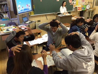初めにアイスブレイク(=ウォーミングアップ)で、カードを使ったあいさつゲームをしました。必ず"マジックワード"(魔法の言葉)と言われる"プリーズ""サンキュー"等を使うというルールがあります。本校教員も楽しくゲームに参加しました。