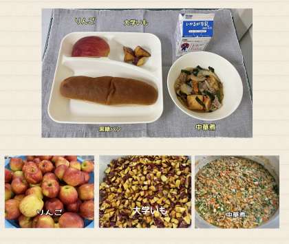 今日の給食では、油で揚げたさつまいもに、砂糖・塩・こいくちしょうゆ・湯を煮てみつを作りからめた大学いもです。