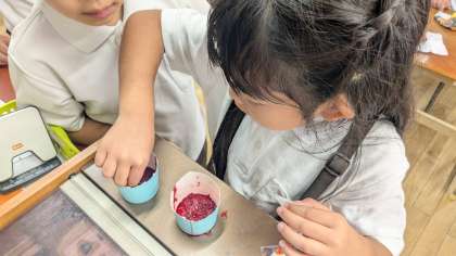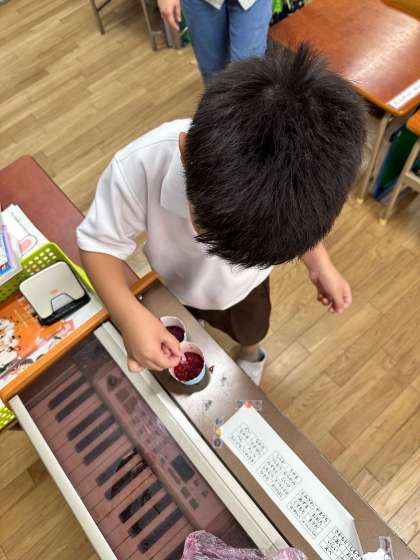 生活科の学習で、あさがおの色染めをしました。あさがおにレモン汁をかけると、赤色に変化して、驚いていました。