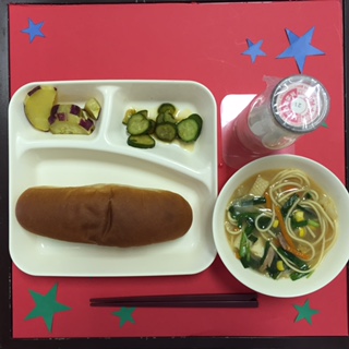 本日の献立は「みそラーメン・きゅうりの辛みづけ・焼きさつまいもの甘みつかけ・パン・牛乳」でした。