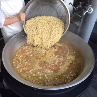 写真右は出来た、みそラーメンのスープに麺を入れている様子です。