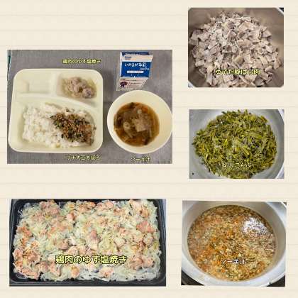 ※鶏肉のゆず塩焼き ※ソーキ汁 ※ツナ大豆そぼろ
