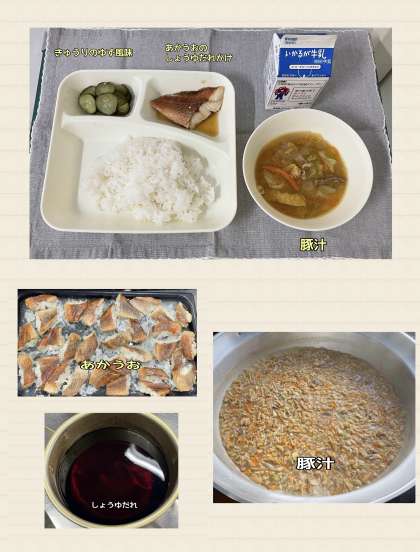 ※あかうおのしょうゆだれかけ ※豚汁 ※きゅうりのゆず風味