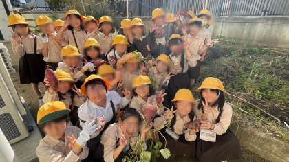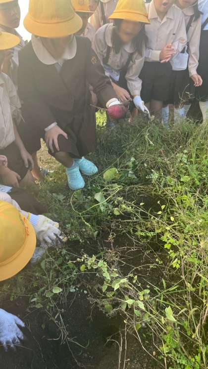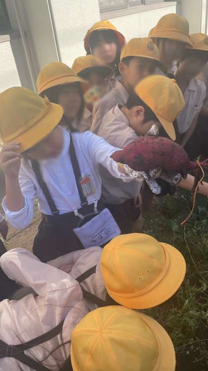 2年生は、今日、お芋掘りをしました。学習園で育てていた芋が育ちました。大きいのから、小さいのまで、色々な形の芋を収穫できました。