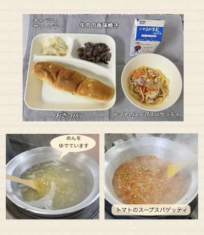 ※牛肉の香味焼き ※トマトのスープスパゲッティ ※キャベツの