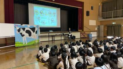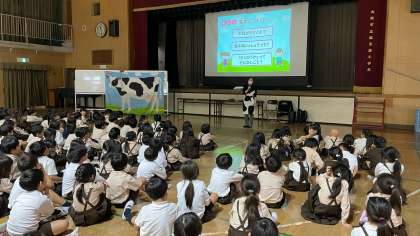 今日は株式会社「明治」より栄養士の方が来て、ミルクについて1・2年生に教えてもらいました。酪農についての知識や、給食などで飲む牛乳の作り方、乳牛の一生など、食育にも繋がる内容でした。明日から牛乳が楽しみになった子もいるようです。
