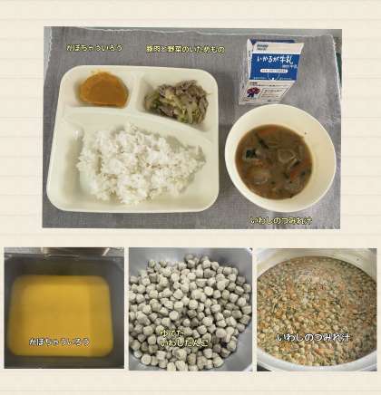 ※豚肉と野菜のいためもの ※いわしのつみれ汁 ※かぼちゃういろう