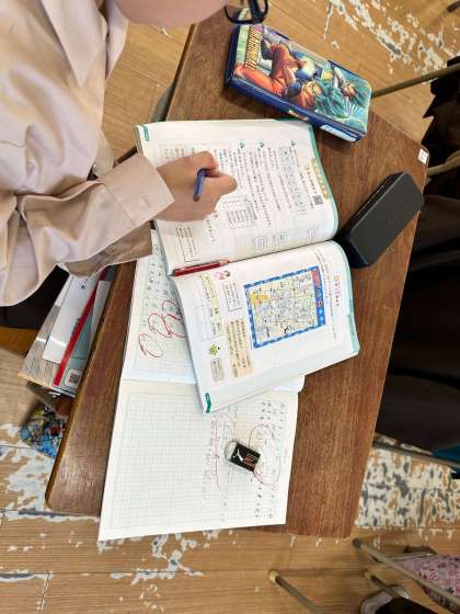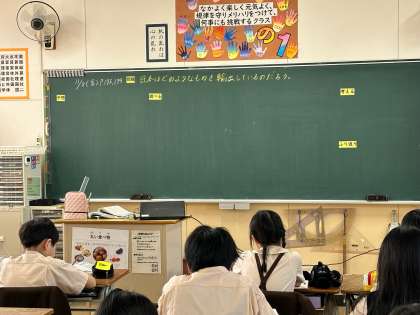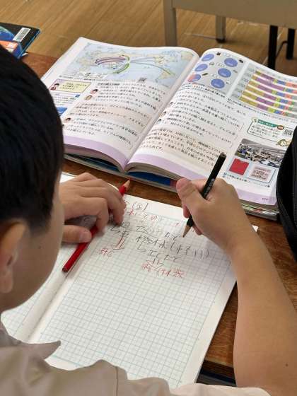五年生は社会科で貿易について学習していました。教科書を見ながら調べ学習をしています。よくよく考えながら、調べものをする姿がとても素晴らしかったです。ノートのまとめ方も上手でした。