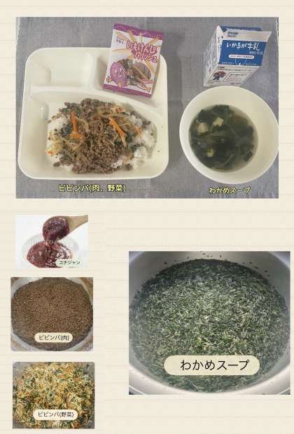 ※ビビンバ(肉、野菜) ※わかめスープ ※いもけんぴフィッシュ