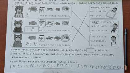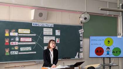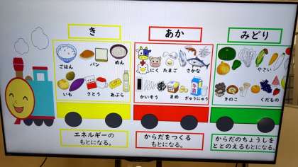 茨田西小学校の仲井先生に来ていただいて、栄養について学習しました。あか、き、みどりの食べ物のなかまをバランスよく食べることが大切だよと教えてもらいました。