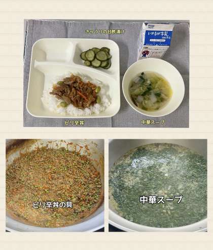 ※ピリ辛丼 ※中華スープ ※きゅうりの甘酢づけ