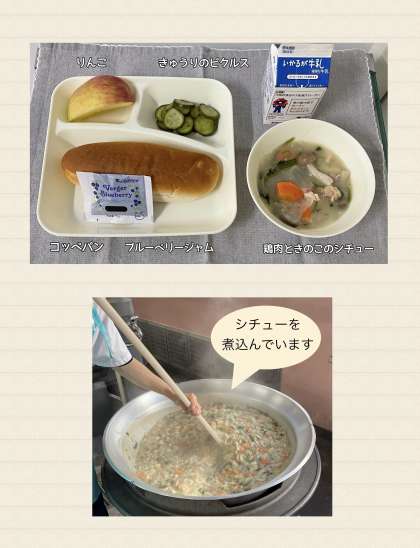 ※鶏肉ときのこのシチュー ※きゅうりのピクルス ※りんご