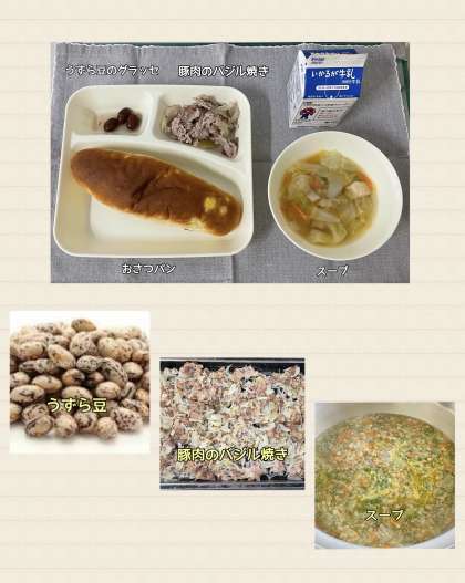 ※豚肉のバジル焼き ※スープ ※うずら豆のグラッセ