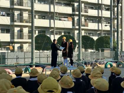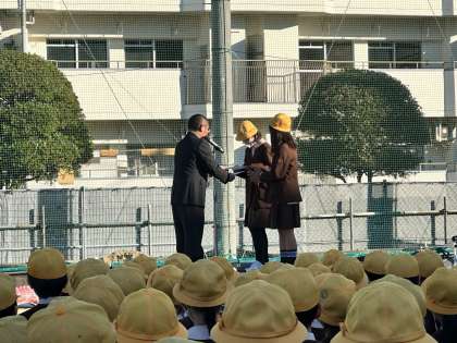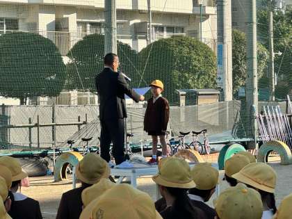 今日は、校長先生のお話のあと、表彰がありました。まずは地域子ども会の50周年記念スポーツ大会の賞状がキックベースとソフトボールのキャプテンに渡されました。次に図工の作品が入選した3名に賞状が渡されました。全校から拍手と共に讃えられていました。素晴らしいです。