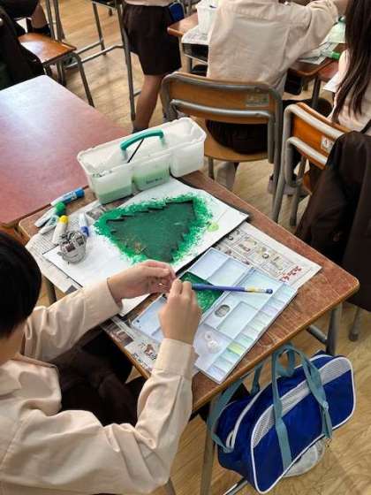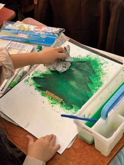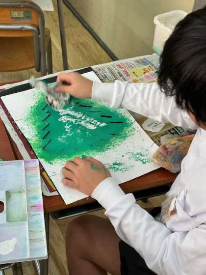 二年生は図工でクリスマスツリーを描いていました。新聞紙に絵の具をつけて、押しながら色をつけます。みんな面白い模様が浮き上がっていました。完成が楽しみですね。