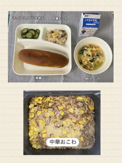 今日の給食では、焼き豚ともち米、くり、干ししいたけの入った中華おこわです。