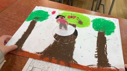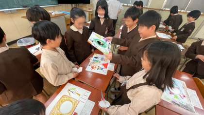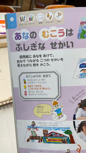 二年生は図工で「穴の向こうは不思議な世界」という題材に取り組んでいました。二枚の画用紙に思い思いの絵を描いて、それを自分の人形で繋ぎます。想像力豊かな作品がいくつもありました。