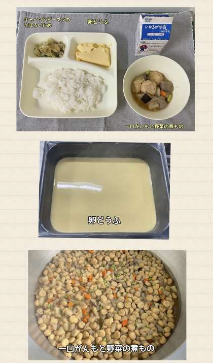 ※卵どうふ ※一口がんもの野菜の煮もの ※キャベツとピーマンの