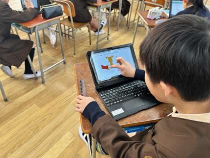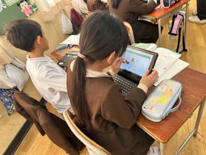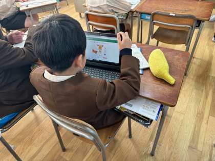 三年生は算数の時間にPCを使って学習していました。図形の単元ですが、画面を触りながら、課題の図形をつくっています。みんなで相談しながら進めている班もありました。素晴らしいですね。