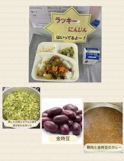 ※豚肉と金時豆のカレーライス ※はくさいのピクルス ※棒チーズ