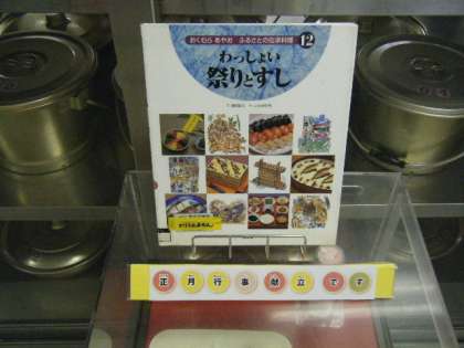 写真中央は本日の給食図書の「わっしょい 祭りとすし」でした。日本各地の伝承料理が載っていました。
