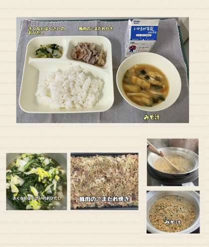 ※豚肉のごまだれ焼き ※みそ汁 ※きくなとはくさいのおひたし