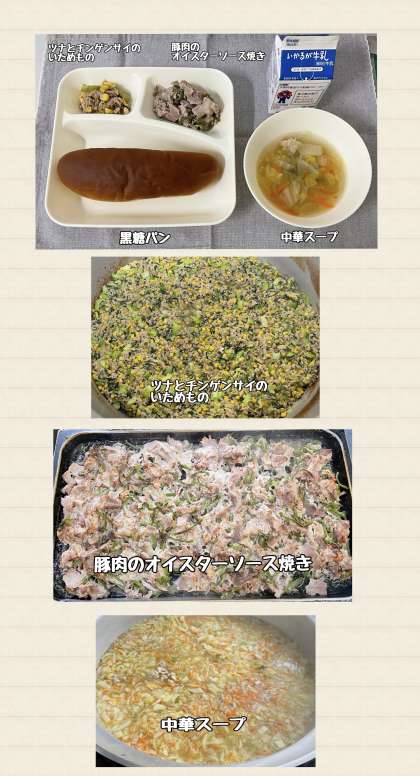 ※ツナとチンゲンサイのいためもの ※黒糖パン ※牛乳